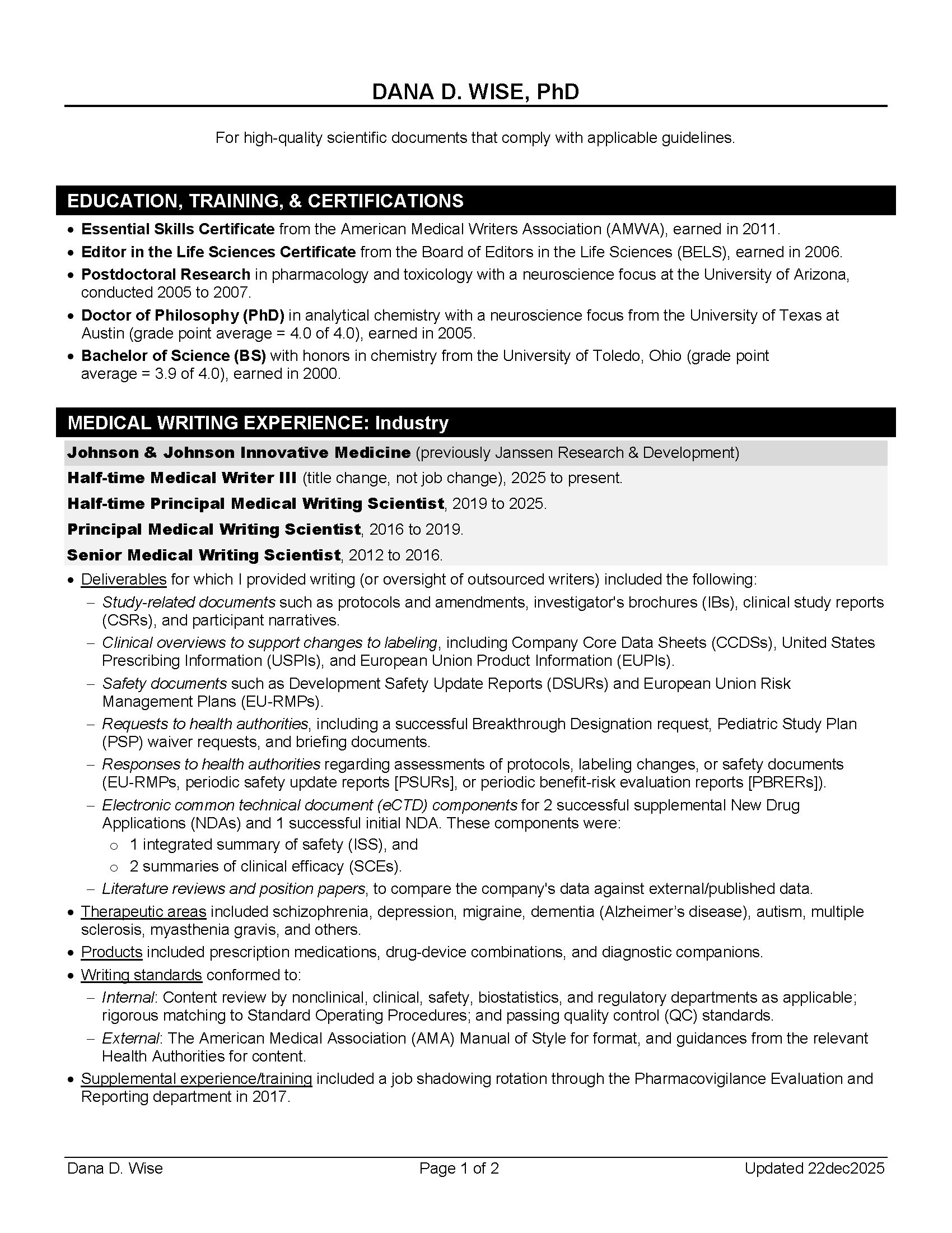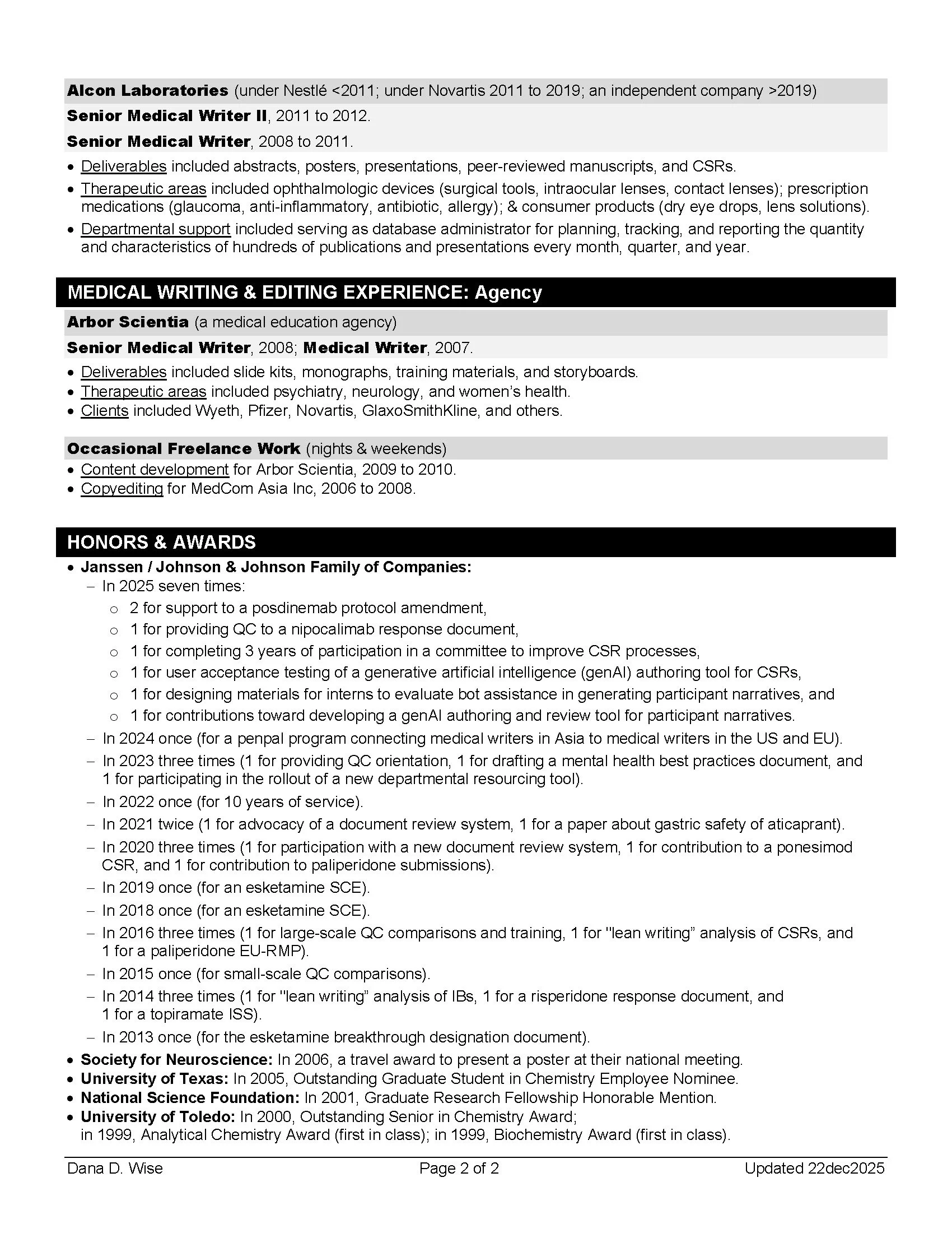 Half-time Principal Medical Writing Scientist, 2019 to 2025.